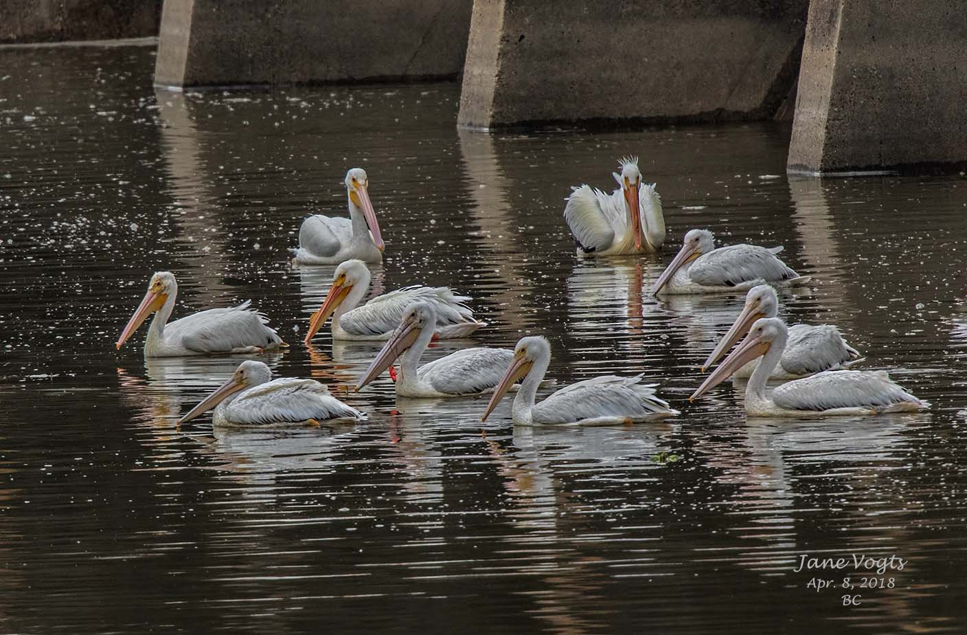 ![]() 11 White Pelicans (notice the one with the fishing cork caught in his bill) |