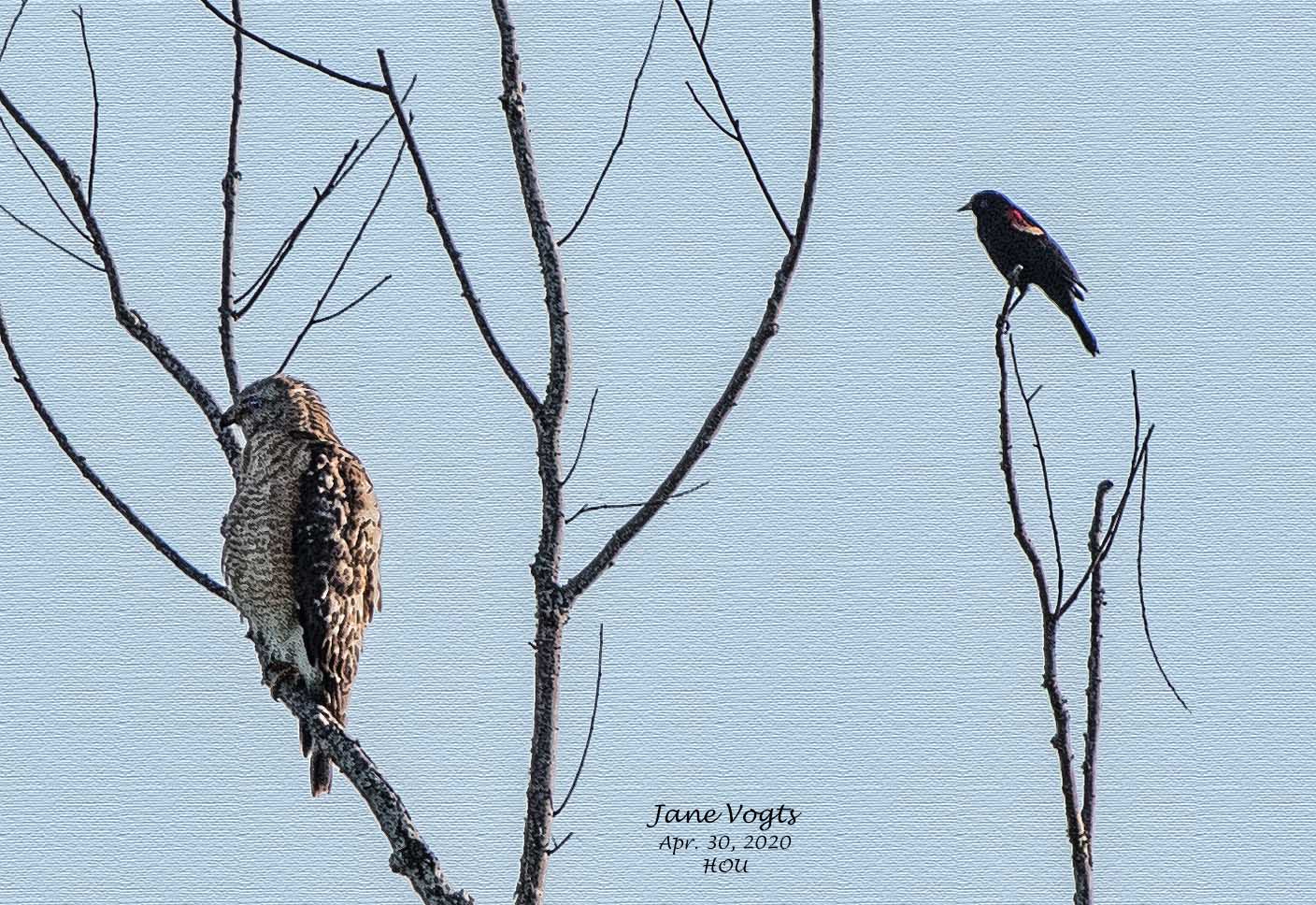 ![]() 31 Artsy shot of Red-shouldered Hawk and Red-winged Blackbird at ~125 yards. |
