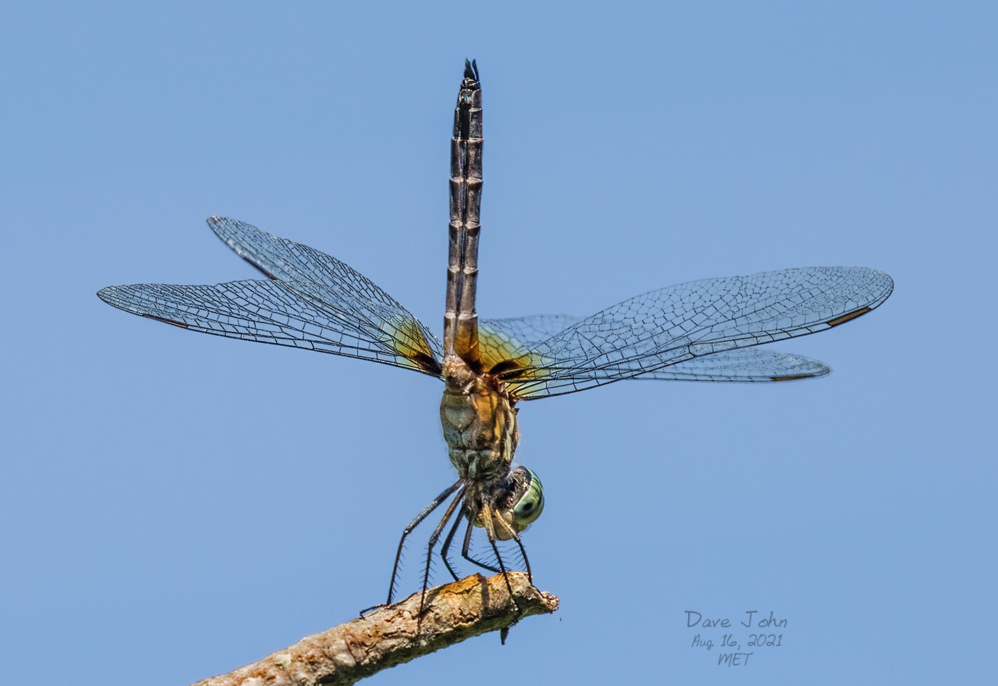 ![]() 22 Female Blue Dasher oblesking (pointing her abdomen towards the sun thought to reduce exposure to the sun during hot weather) |