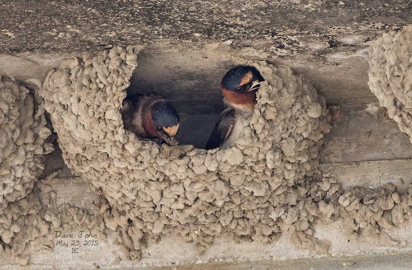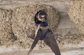 ![]() 44 Cliff Swallows transferring mud |
