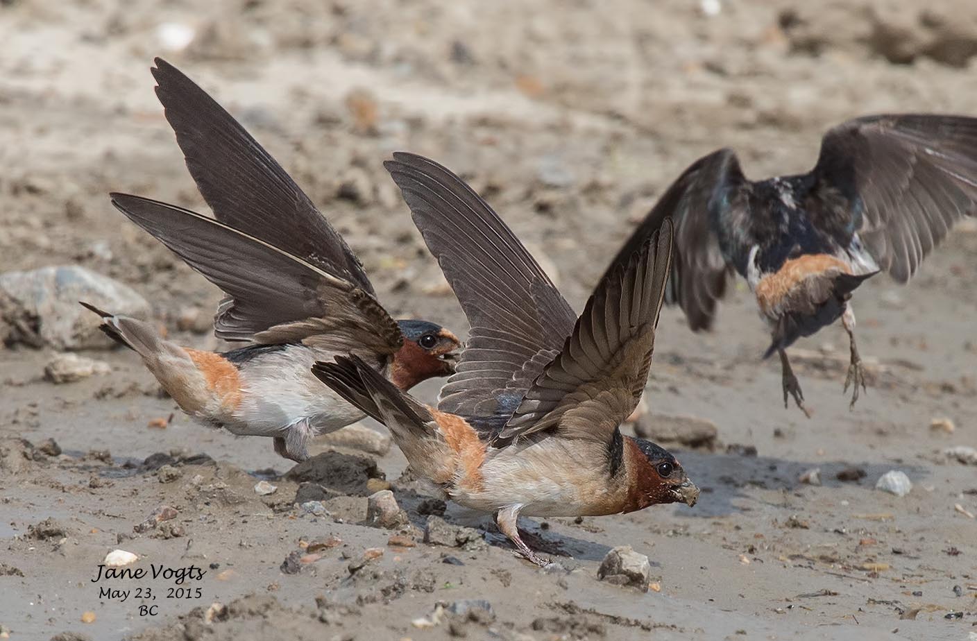 ![]() 4 Cliff Swallows collecting mud for nest building |