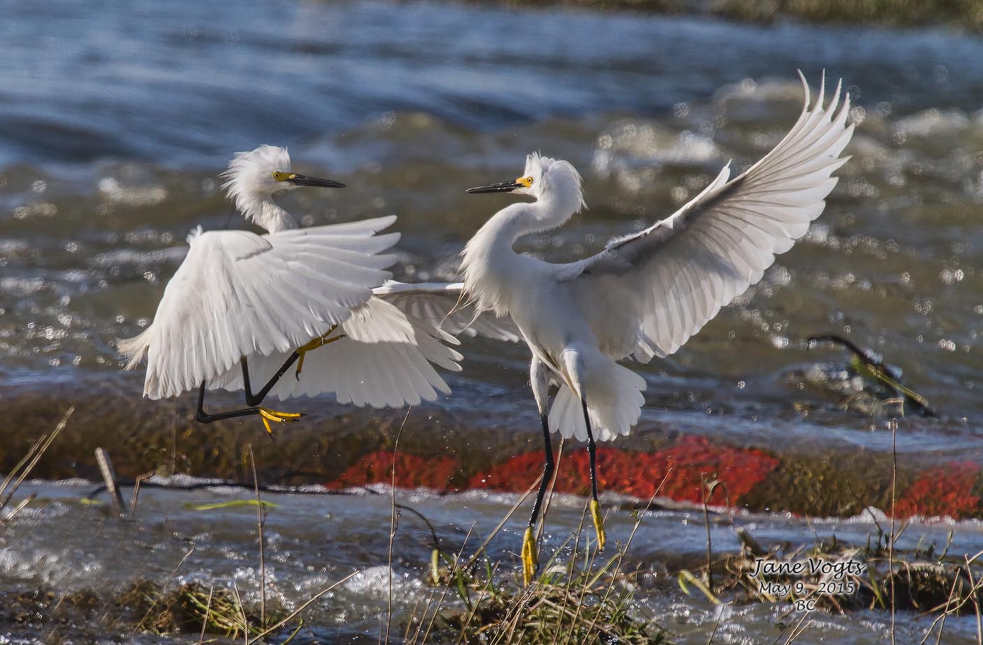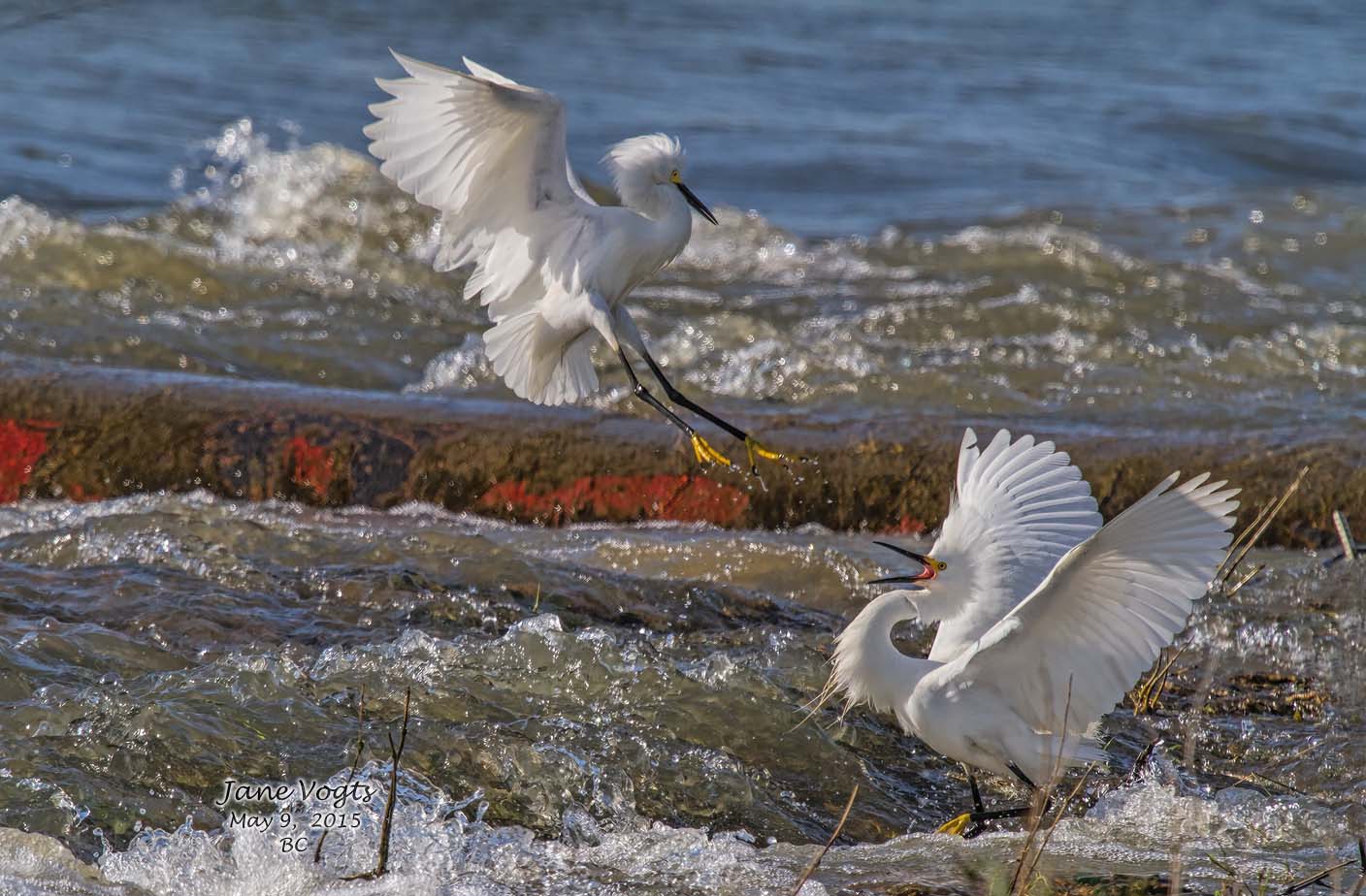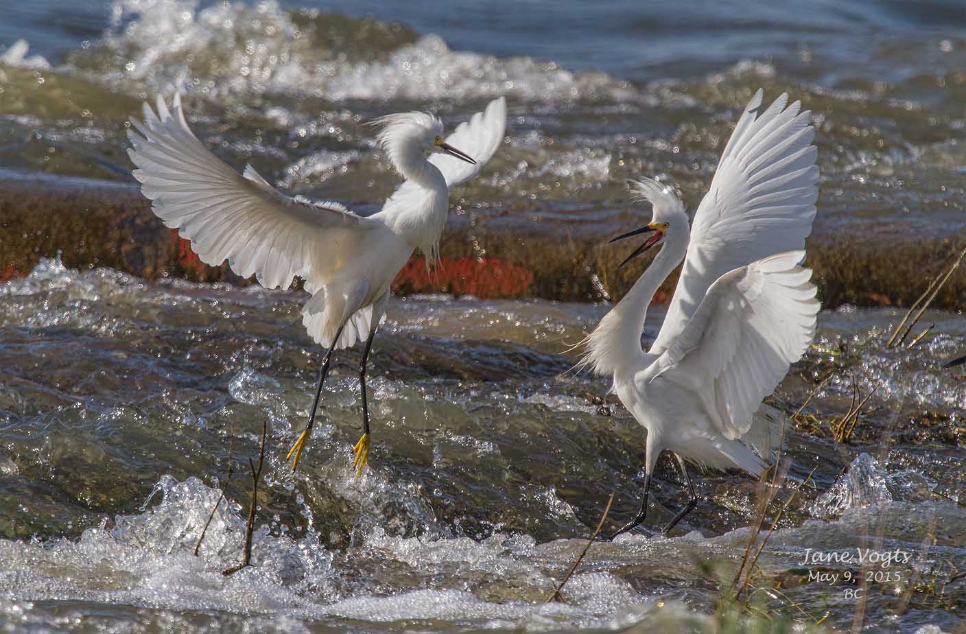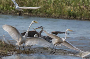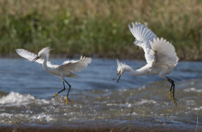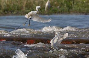 ![]() 21 Snowy Egrets squabbling over fishing territory |