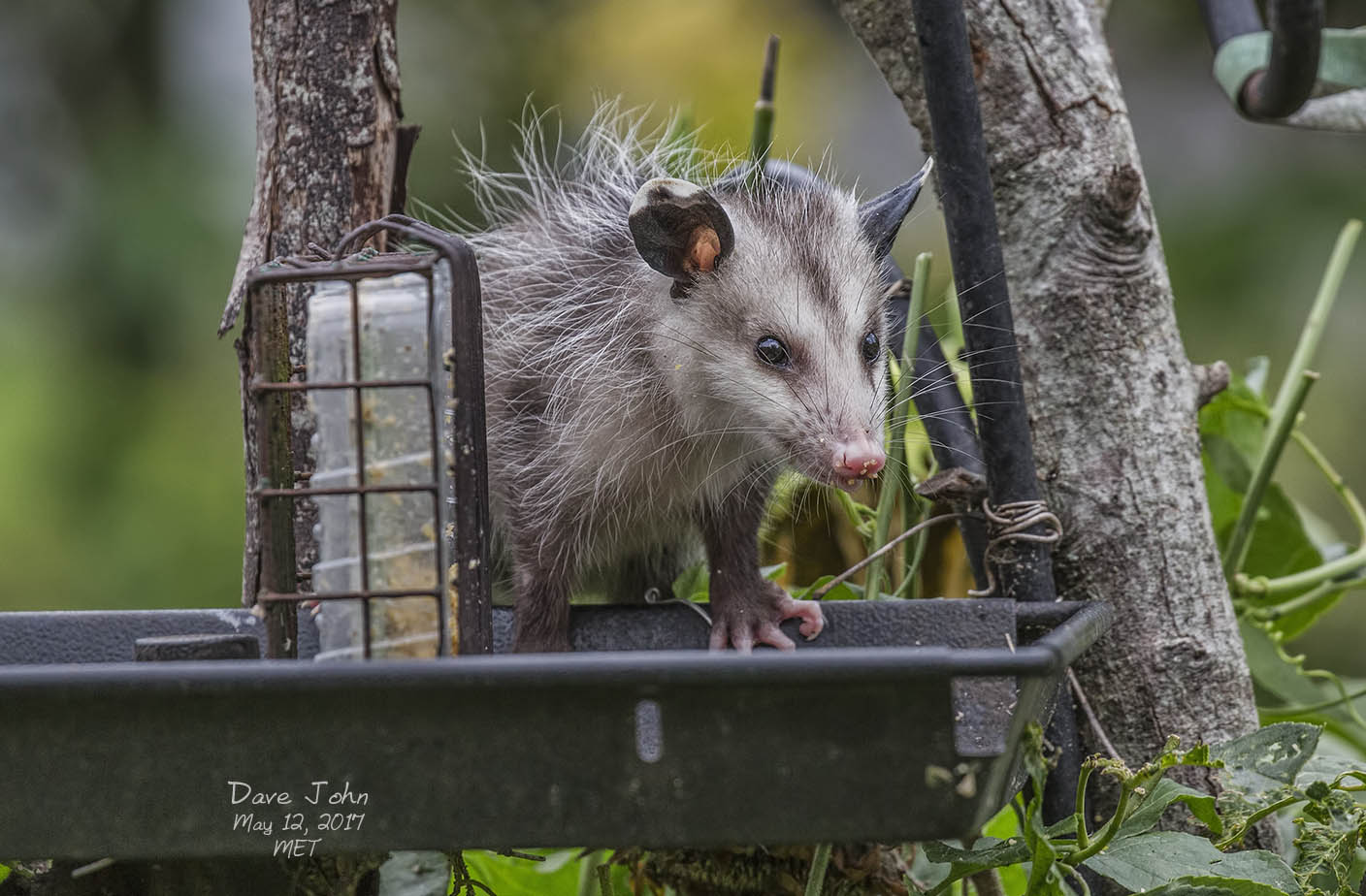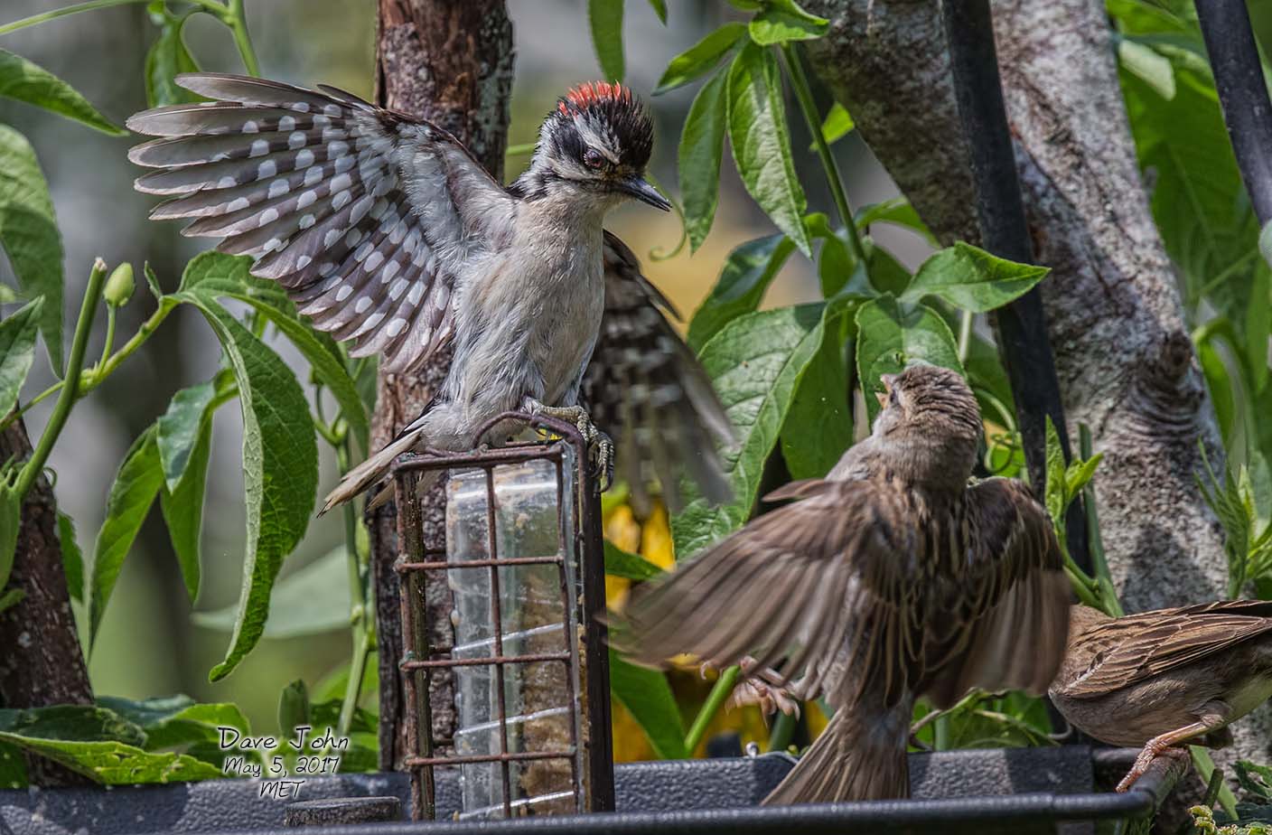 ![]() 4 Male Downy Woodpecker and female House Sparrow contesting the feeder. |