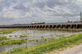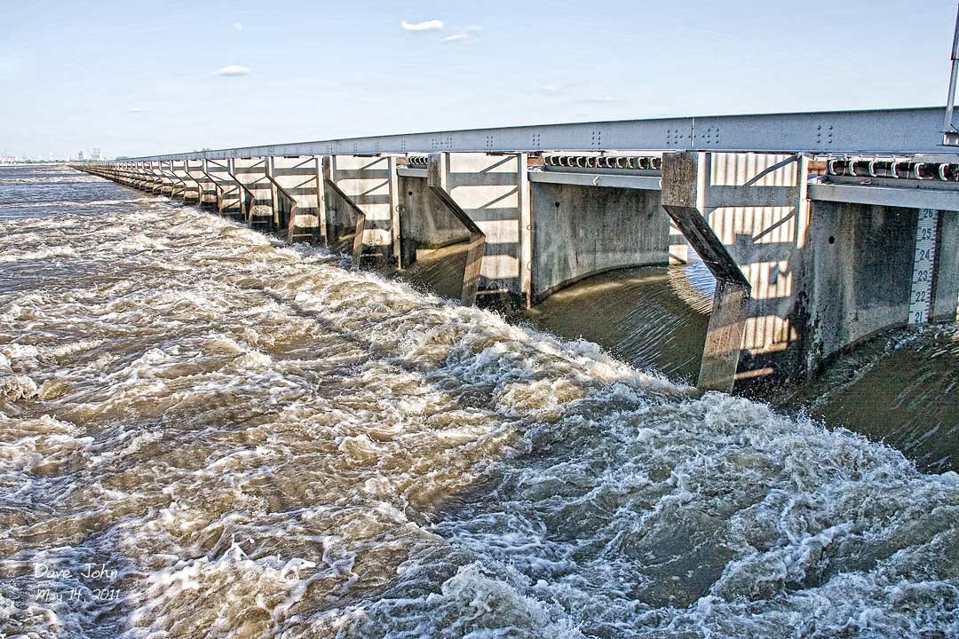 Water trickling through the closed gates of the Bonnet Carre Spillway on