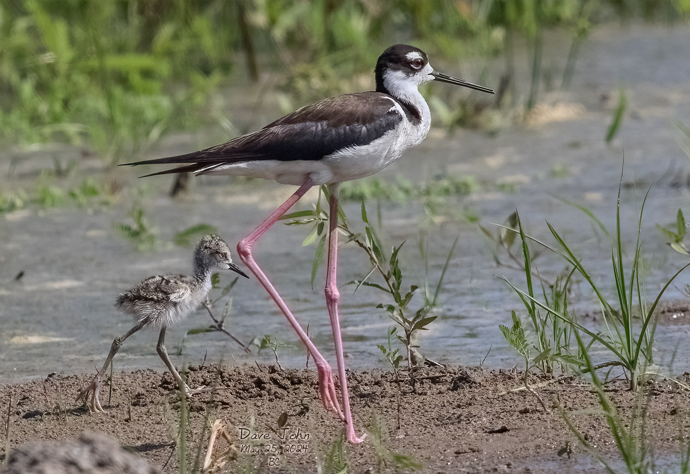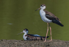 Blacknecked Stilt adult in front of her juvenile |